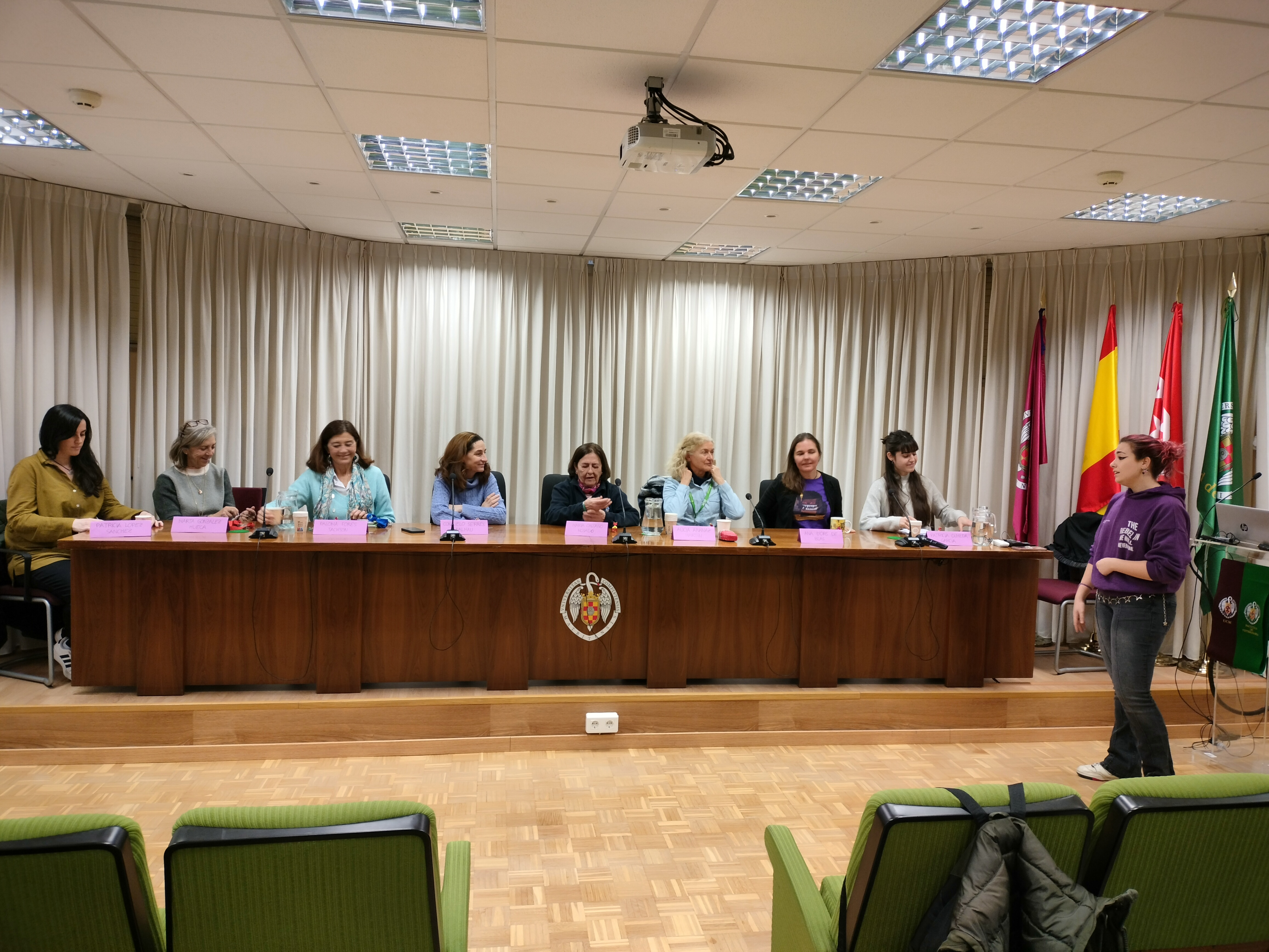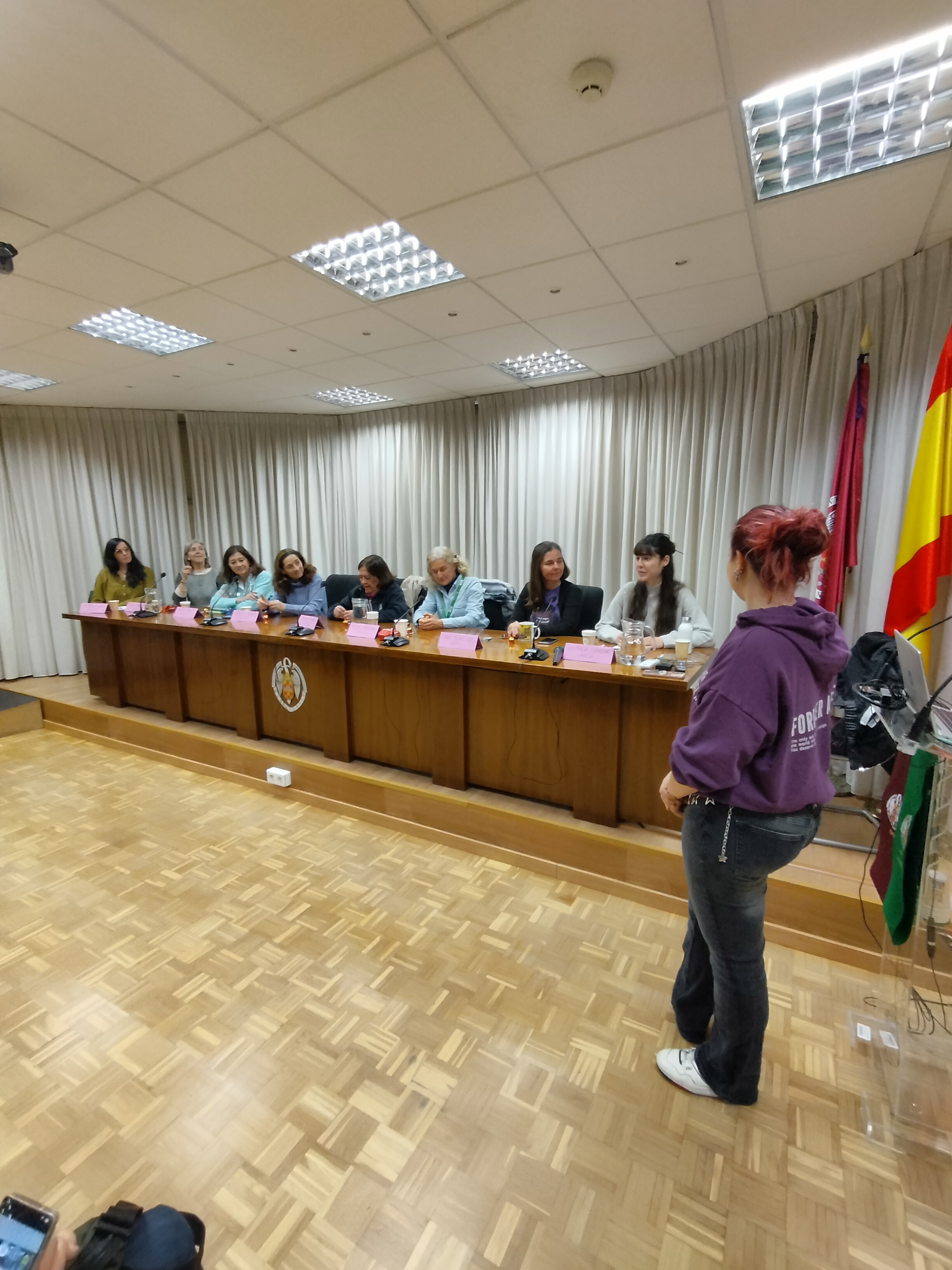 Con motivo del 8 de Marzo, día internacional de la Mujer, la asociación de estudiantes LAIKA, organizó una mesa redonda con la participación de 8 de nuestras compañeras docentes de la Facultad de Veterinaria. Al evento asistieron estudiantado y profesorado de la facultad. Las ponentes fueron María Castaño, Consuelo Serres, Paloma Fores, Marta González, Alicia Aranaz, Ana D’ors, Patricia Olmeda y Patricia López. La moderación corrió a cargo de la presidenta de la asociación Elba Paniagua, que fue introduciendo temas de interés y relacionados con el significado de la jornada. Desde el techo de cristal, la corresponsabilidad, la conciliación o la maternidad y su compatibilidad con el desarrollo de la carrera académica o profesional, temas de gran interés y permanente vigencia para llegar a la verdadera igualdad, fueron analizados por las participantes. Un aspecto reseñable fue el amplio rango de edad de las participantes, desde los veinte hasta los ochenta, lo cual permitió contrastar logros conseguidos en todo este tiempo. No obstante y con respecto a estos logros, quedó claro un mensaje: en ningún caso son derechos consolidados y hay que estar vigilantes para no retroceder en ellos. El evento trasnscurrió en un ambiente constructivo y sirvió como puesta en común de experiencias e intercambio de opiniones también con el público asistente.
